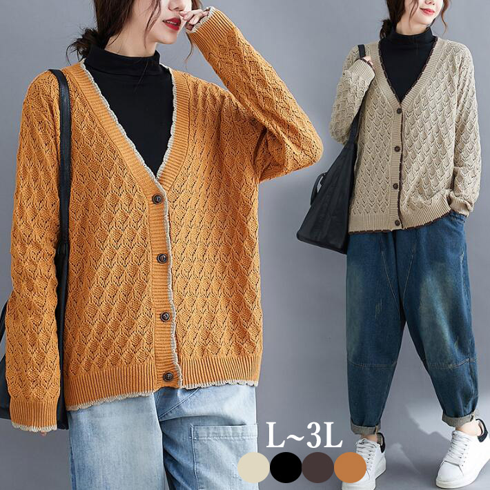 ニットカーディガンカーディガン アウターニットカーデ ざっくり ゆるニット ニットトップス 前開き ボタン付きゆったり 春秋 長袖 大きめレディース無地L2L3L