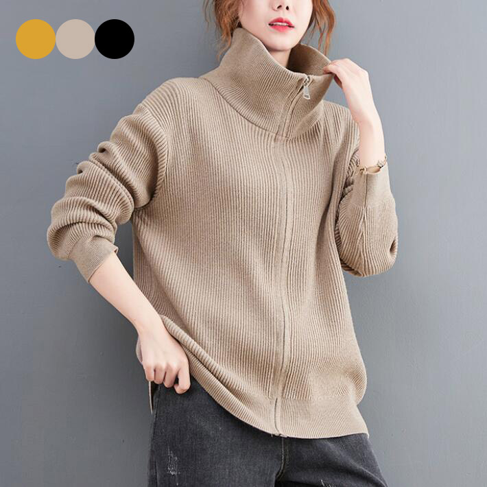 ニットセーターカーディガン レディーススタンドカラー アウターチュニック前開ききれいめニットゆるニット ショート丈春秋 長袖カジュアル無地厚手ジップアップ