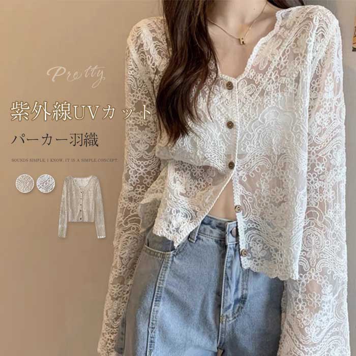 カーディガン 刺繍 レース レディース UVカット トップス 冷房対策 シアー感 Vネック チュール 長袖