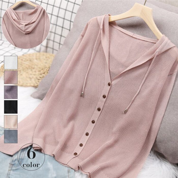 カーディガン フード付きカーディガン ニット 薄手 ボタン 羽織り カット 紫外線対策 エアコン対策 無地 長袖 春 夏 フェミニン カジュアル トップス