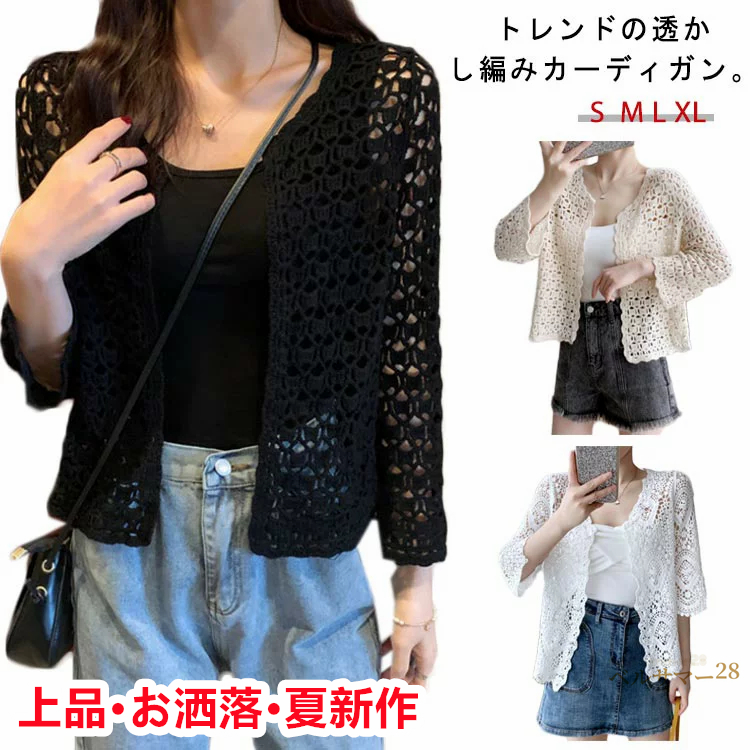 カーディガン レディース 長袖サマーカーディガン 透かし編み ニットカーディガン冷房対策七分袖 透かし編み ニットカーディガン サマーカーディガン ショート丈 透け感 レース カーデ