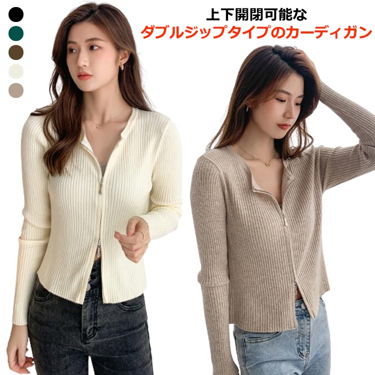 ダブルジップ リブ カーディガン クロップド ショート丈 トップス ニットセーターレディースファッション トップス カーディガン ボレロ
