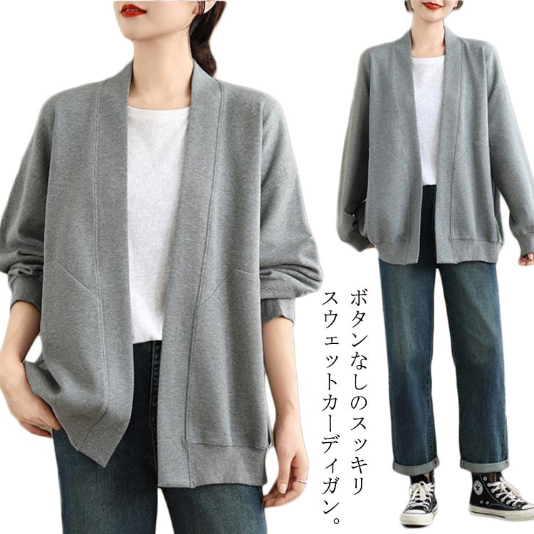 ヒップが隠れる スウェット カーディガン 長め丈 ライトアウター 羽織り 秋服 秋物 ノーカラー ジャケット スプリングコート ドロップショルダー オーバーサイズ