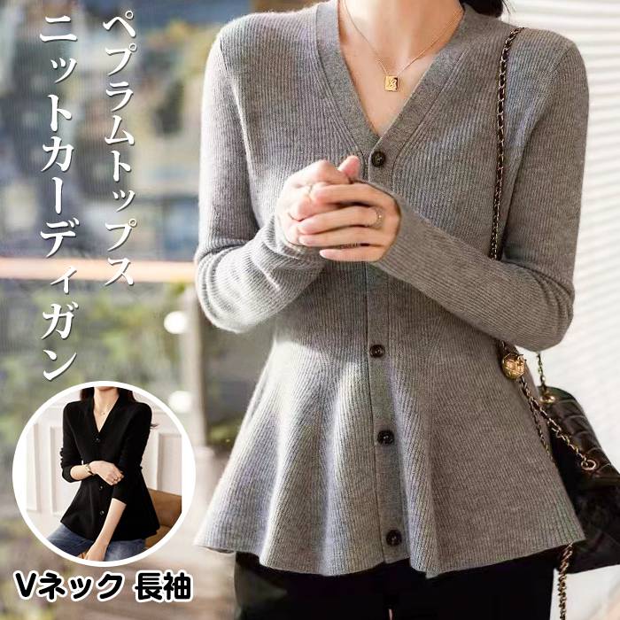 ニットカーディガン リブニット レディース ニット トップス ペプラムトップス ペプラムカーディガン ペプラム vネック 長袖 ボタン 羽織 体型カバー ママ お母さん