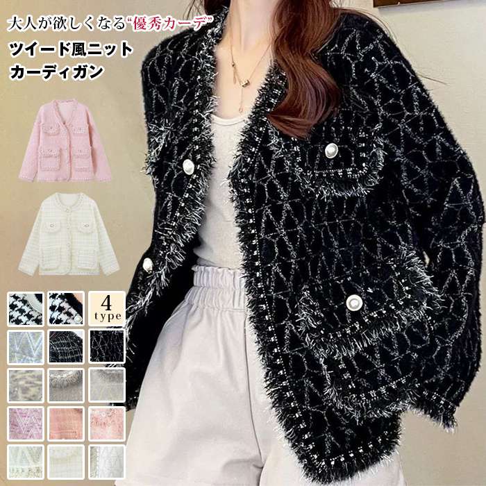 ツイード風 ニットカーディガン レディース トップス 羽織り カーディガン ネック ゆったり 長袖 きれいめ エレガント カジュアル おしゃれ オフィス 通勤 セレモニー