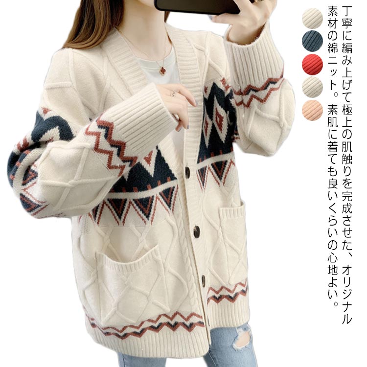 ノルディック柄 カーディガン 秋 ニット 通勤 冬 ニットカーディガン 長袖 レトロ レディース カジュアル 秋 冬 トレンド 大人可愛い Uネック
