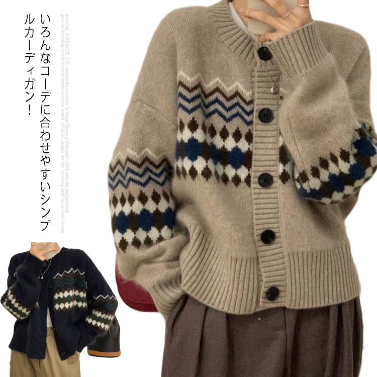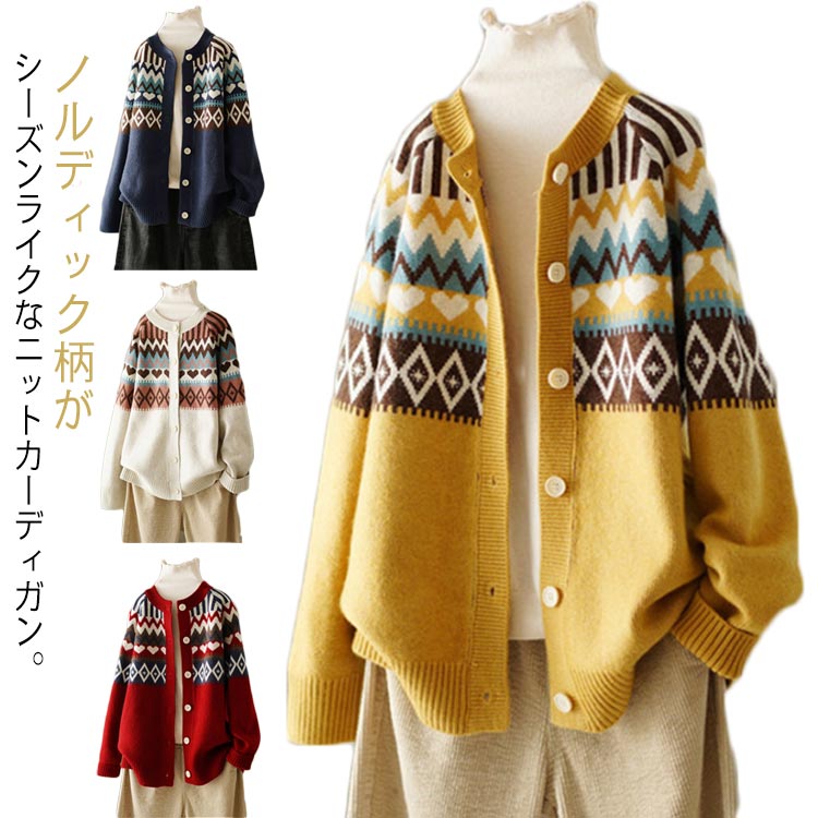 ノルディック柄 カーディガン 秋 ニット 通勤 冬 ニットカーディガン 長袖 レトロ レディース カジュアル 秋 冬 トレンド 大人可愛い ネック