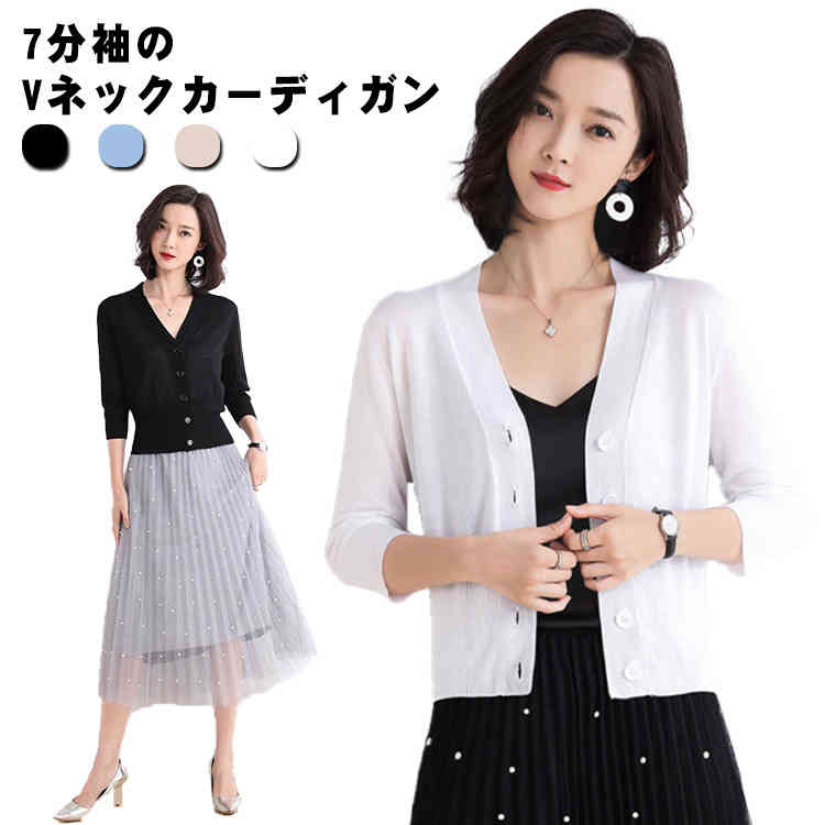 7分袖カーディガン ニットカーディガン 冷房対策 カット ブラック ホワイトレディースファッション トップス カーディガン ボレロ