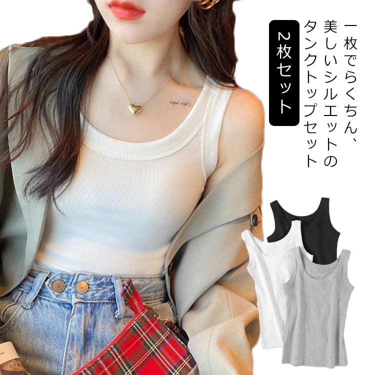 タイト ギフト レディース 2枚セット 重ね着 ノースリーブ 大きいサイズ タンクトップ キャミソール 無地 シンプル 着瘦せ おしゃれ トップス レイヤード 着回し 定番 インナー ブラック ホワイ