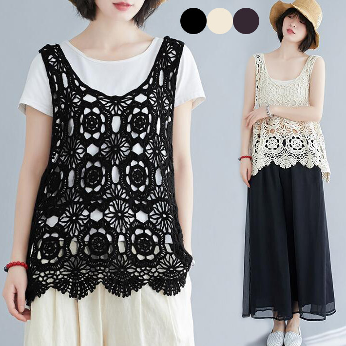 レースタンクトップレディース花柄刺繍ニット重ね着キャミソール ネックロング インナー袖なし ノースリーブ通年大きめオーバサイズ透け