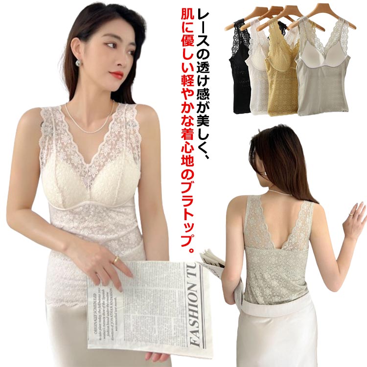 ブラトップ 肌見せ 透かし 総レース タンクトップ カップ付き ノンワイヤー インレディースファッション トップス タンクトップ