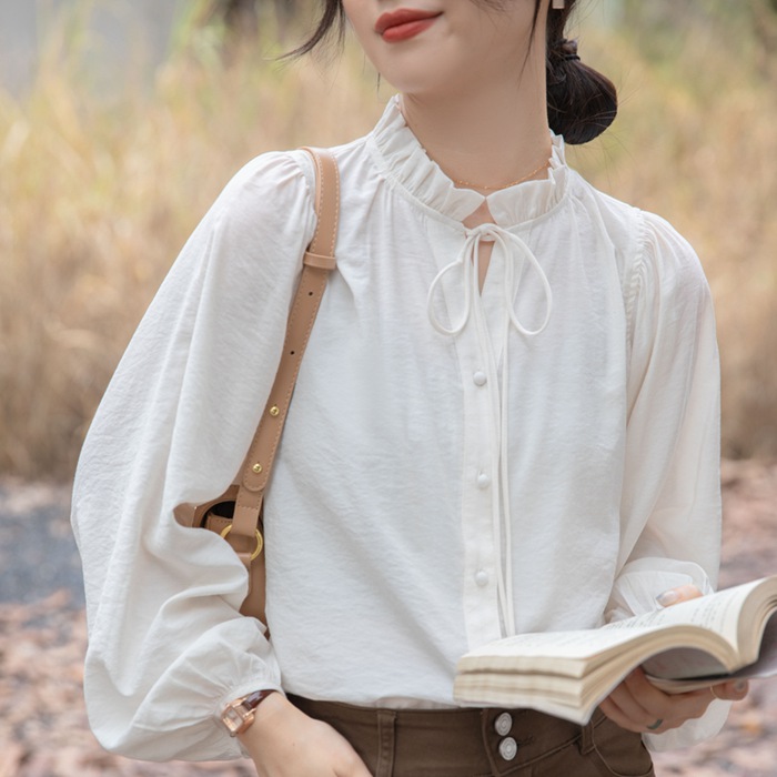 ブラウス レディース トップス バンドフリルカラー ボリューム袖 ゆったり フォーマル おしゃれ 上品 きれいめ 通勤