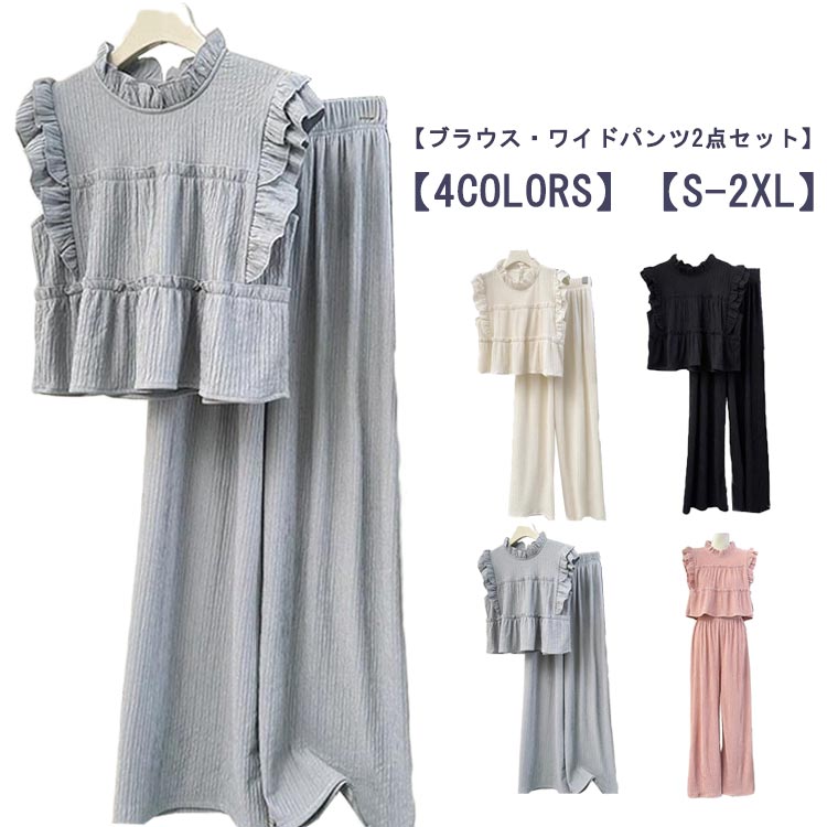 フリル ノースリーブ セットアップ カジュアル ボトムス ノースリーブ ブラウス パンツ 長ズボン 夏 ティアード レディース