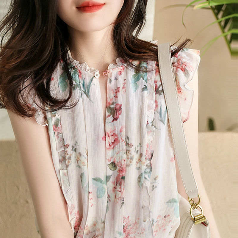 レディースブラウスフリルノースリーブショートシャツトップス大人ガーリーカジュアルキュート可愛いフェミニンきれいめ上品おしゃれお出かけオフィス