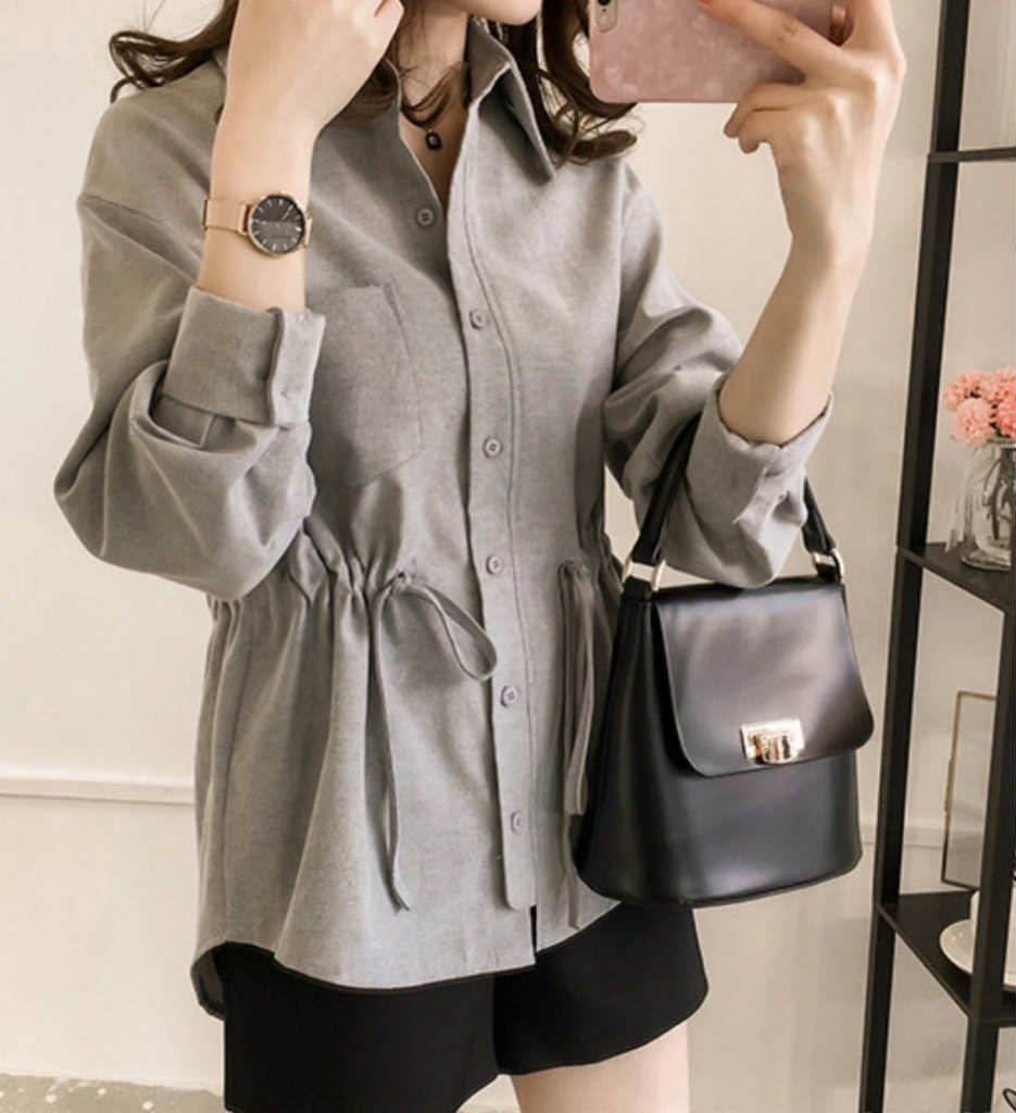 レディーストップスペプラムシャツウエスト紐チュニック長袖無地春秋カジュアルキュート大人可愛いエレガントフェミニンオフィスお出かけデート
