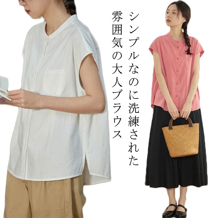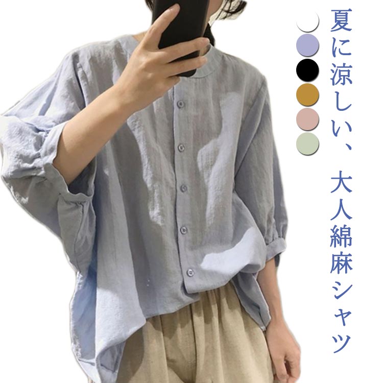 綿麻 トップス 体型カバー 7分袖 ブラウス ナチュラル カジュアル おしゃれ 可愛い シャツ 薄手 大人 通勤 女性 おしゃれ ノーカラー レディース 通学 大きいサイズ 仕事 ゆったり 無地