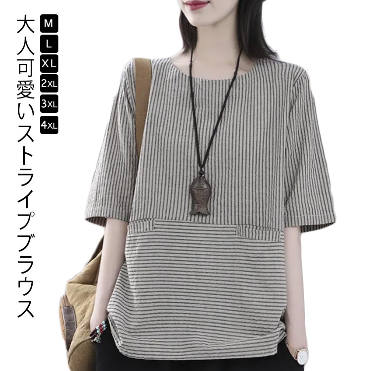 五分袖 M~4XL 薄手 ゆったり 大人可愛い ストライプブラウスレディースファッション トップス シャツ ブラウス
