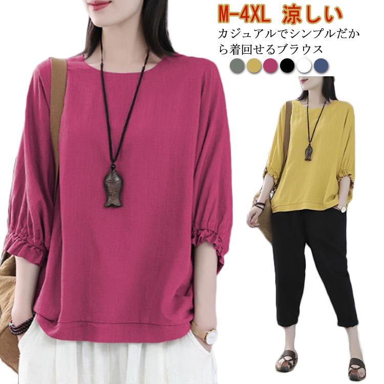 綿麻 トップス 体型カバー 7分袖 ブラウス ナチュラル カジュアル おしゃれ 可愛い シャツ 薄手 大人 通勤 女性 おしゃれ ノーカラー レディース 通学 大きいサイズ OL 仕事 ゆったり 無地