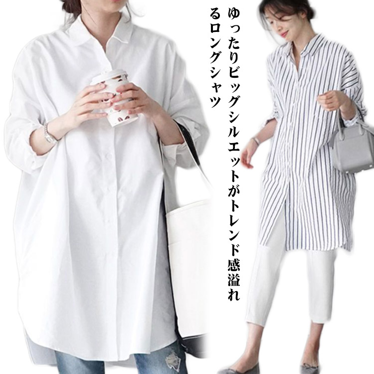 シャツ 長袖ブラウス ゆったり レディース トップス 長袖 チュニック 綿 折襟 コットン ライン 無地 ボタン付き 前後差 大きめ 30代 40代 体型カバー 通勤 春秋 オシャレ シンプル 着瘦