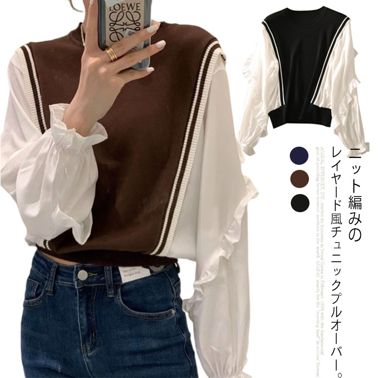 大人カジュアル ニット トップス プルオーバー きれいめ レイヤード ベスト シャツ 無地 フェミニン シンプル
