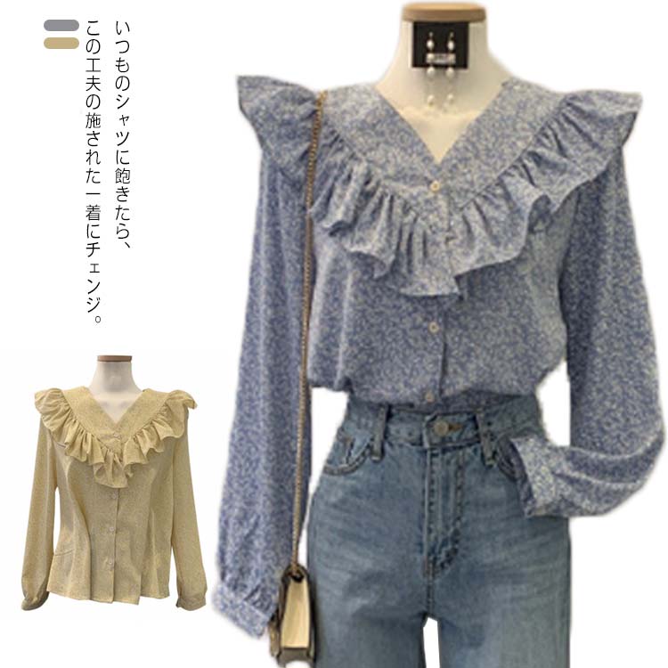 シャツ ブラウス レディース トップス Vネック 長袖 ジョーゼット 春秋 花柄 フリル衿レディースファッション トップス シャツ ブラウス