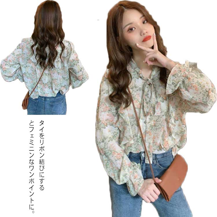 ボウタイシャツ ブラウス レディース トップス リボン 花柄 長袖 ジョーゼット 春秋レディースファッション トップス シャツ ブラウス