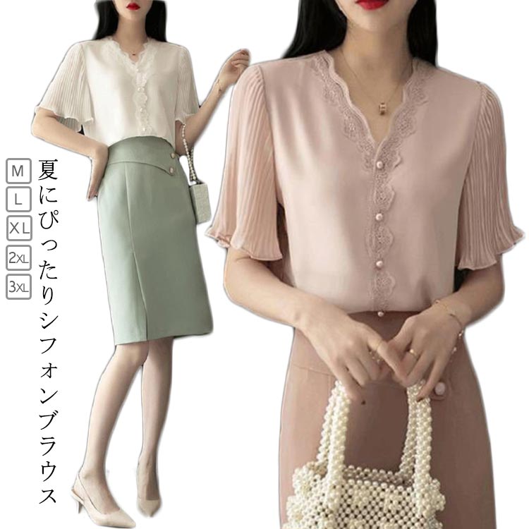 シフォンブラウス 上品 半袖 大人可愛い Vネック M~3XLレディースファッション トップス シャツ ブラウス
