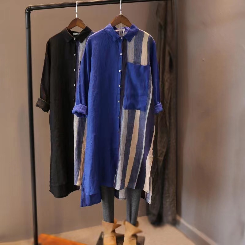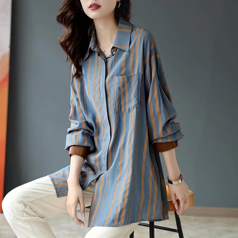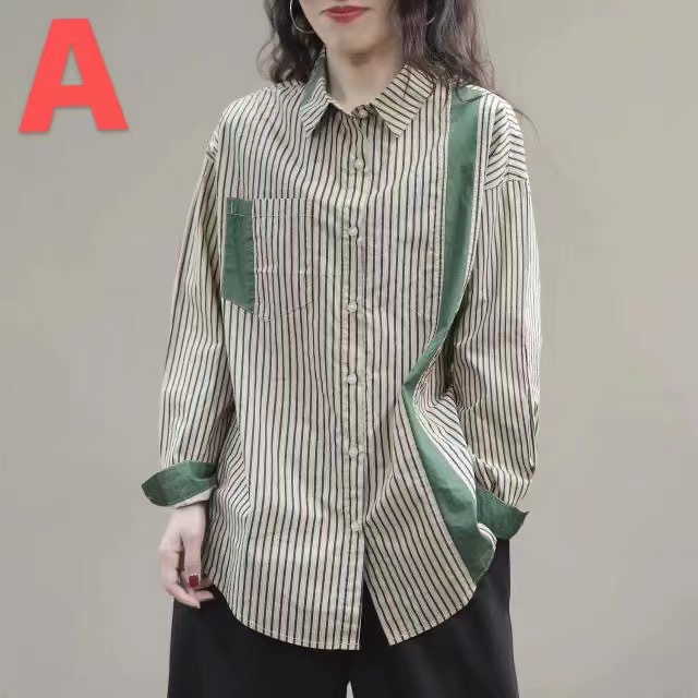 レディース トップス シャツ ロング 春夏 ゆったり 可愛い ストライプ柄 長袖 大きいサイズ 018