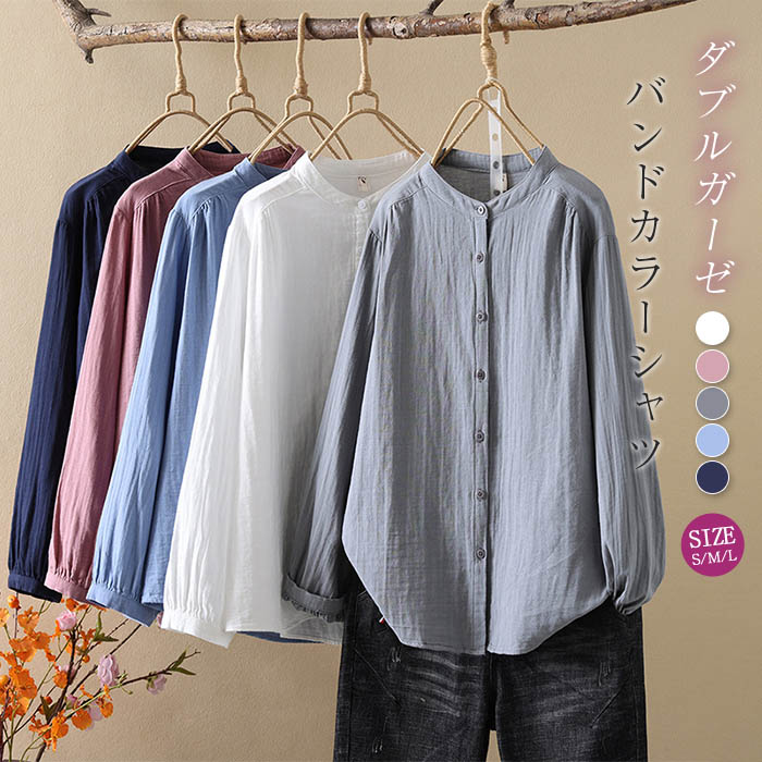 長袖追加 バンドカラー ガーゼ シャツ レディース 春 夏 秋 ダブルガーゼ 綿100% シャツブラウス ガーゼシャツ シャツ ブラウス 半袖 長袖