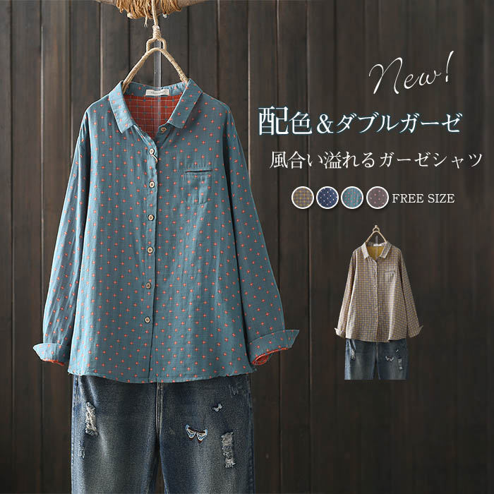 ガーゼシャツ シャツブラウス レディース 春 ガーゼ シャツ ブラウス 長袖 トップス 総柄 カジュアル 可愛い ダブルガーゼ 2重ガーゼ 配色 秋シャツ
