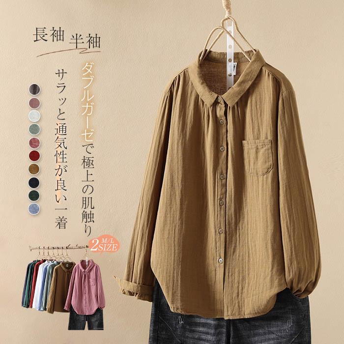 長袖追加 ガーゼ シャツ 2重ガーゼ シャツブラウス レディース 半袖 長袖 トップス 春 夏 秋 ガーゼシャツ