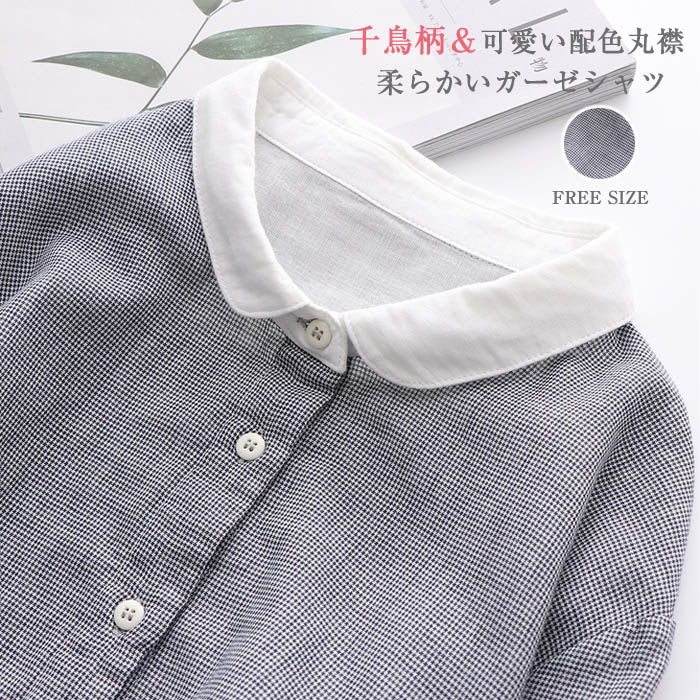 ガーゼシャツ 綿100% シャツブラウス レディース 丸襟 シャツ ブラウス 長袖 トップス 羽織り ガーゼ カジュアル 千鳥柄 2重ガーゼ 大きいサイズ ゆったり