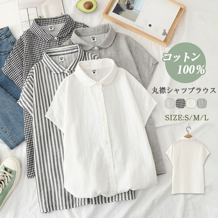 7色 ガーゼシャツ 綿100% シャツブラウス レディース 丸襟 シャツ ブラウス トップス フレンチスリーブ カジュアル 無地 チェック ストライプ 千鳥柄