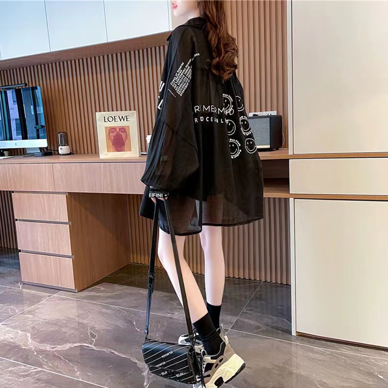 レディース 夏 ゆったり 透け感 クール トップス カジュアル 長袖 ボリューム袖 羽織り はおり 透け感 シアーシャツ シースルー ロング 長め 薄手 可愛い アウター シャツ プリントシャツ スマ