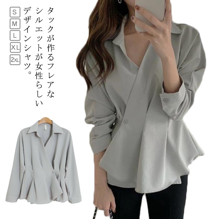 ワイシャツ 春夏 秋冬 トップス Aライン 折り襟 ゆるシャツ ゆったり 大きめ 無地 長袖 ラウンド裾
