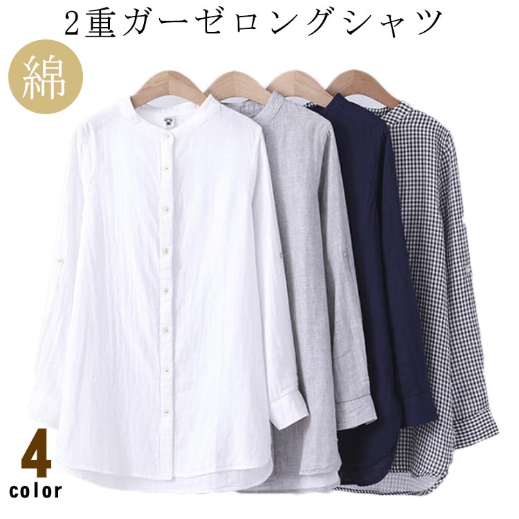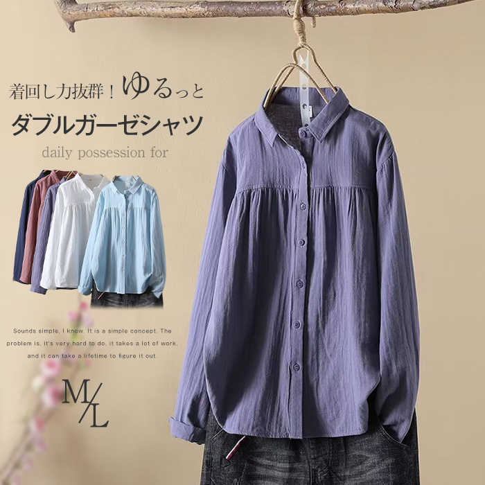 シャツ レディース 長袖 おしゃれ ダブルガーゼ ガーゼシャツ 春秋 折り襟 トップス ブラウス ゆったり 体型カバー きれいめ 抜き襟 オーバーサイズ フォーマル オフィス 通勤 着やせ 前開き 2