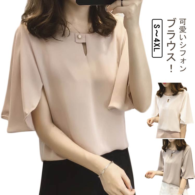 フレアスリーブ プルオーバー シフォン ブラウス 5分袖 クルーネック ビジネス 通勤レディースファッション トップス シャツ ブラウス