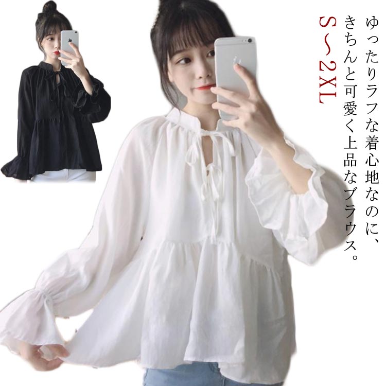体型カバー ふわり袖 襟リボン 襟リボン トップス シャツ シースルー リボンブラウス ゆったり シャツ ギャザー レディース 切り替え フリル スキッパー ブラウス ギャザーフリルブラウス