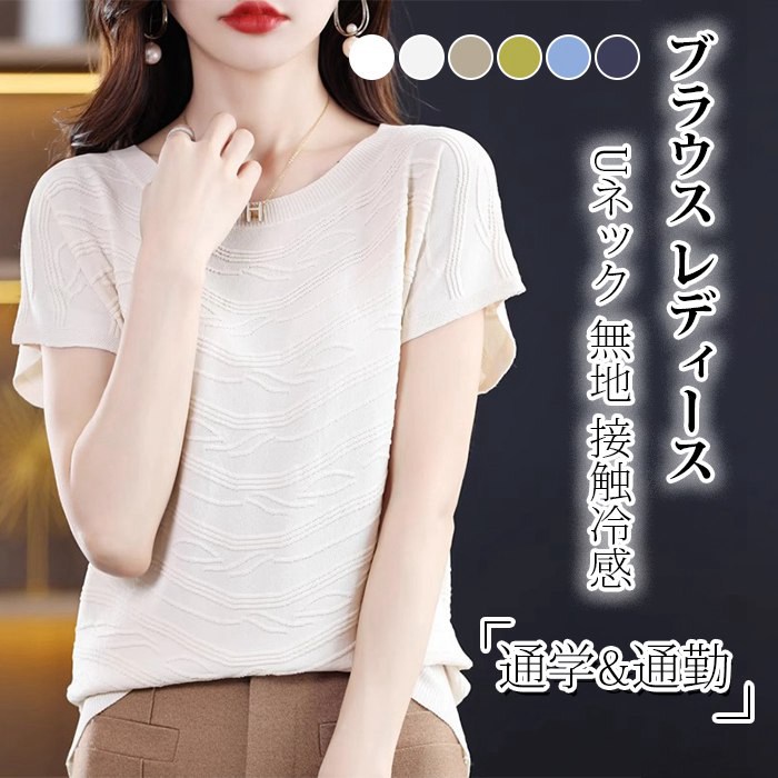 ブラウス レディース 半袖 トップス 夏 Uネック サマーニット ニットソー 無地 接触冷感 カジュアル 軽量 シンプル