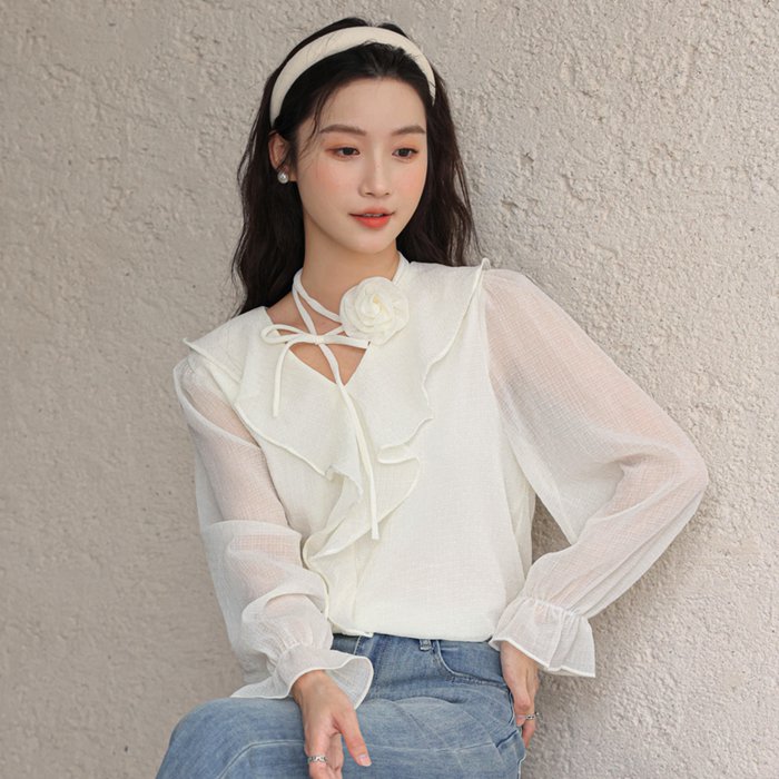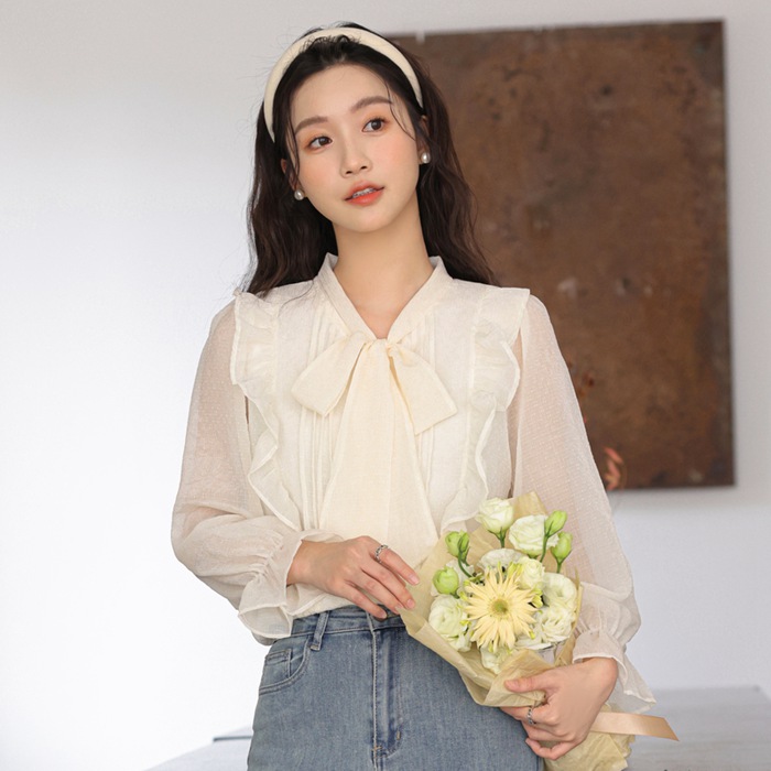 シャツ ブラウス レディース リボン トップス フリルブラウス 落ち感 魅力 お洒落 プルオーバー 長袖 無地 新生活