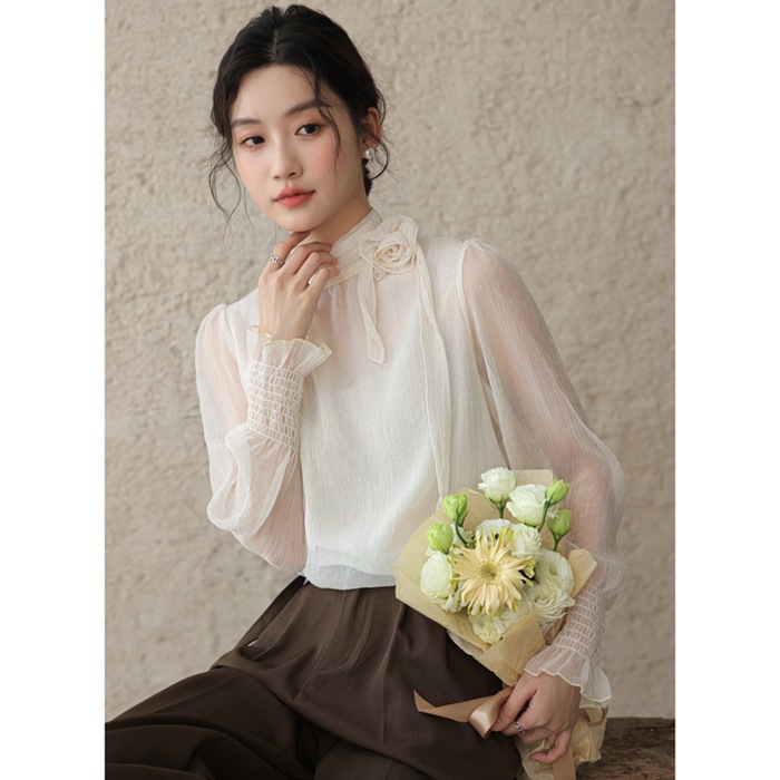 ブラウス レディース 長袖 レース トップス 総レース シースルー シャツ ブラウス ハイネック 花柄 袖コンシャス レディース 総レース レディトップス