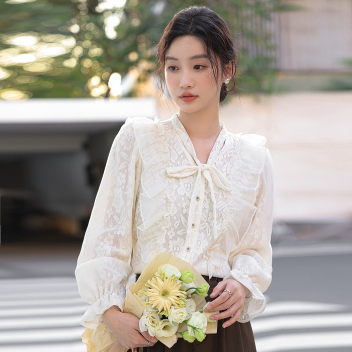 レースブラウス ボウタイ レディース オフィス フォーマル 長袖 きれいめ 秋 春 おしゃれ かわいい