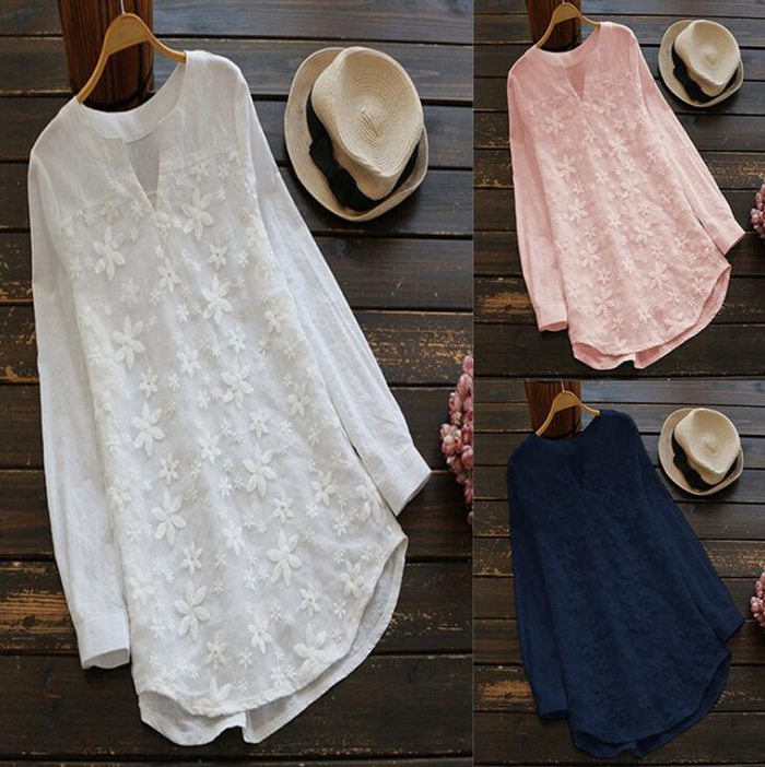 小花刺繍ブラウス tシャツ チュニック 長袖シャツ レース 長袖 レディース Vネック 刺繍 花柄 トップス 可愛い ゆったり ファッション