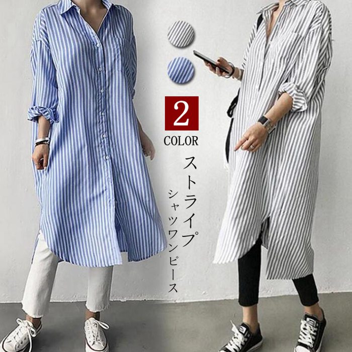 シャツワンピース ロングシャツ ワンピース ミディアム丈 長袖 シャツ レディース スリット入り チュニック ストライプ シャツワンピ 2色 春夏 新作