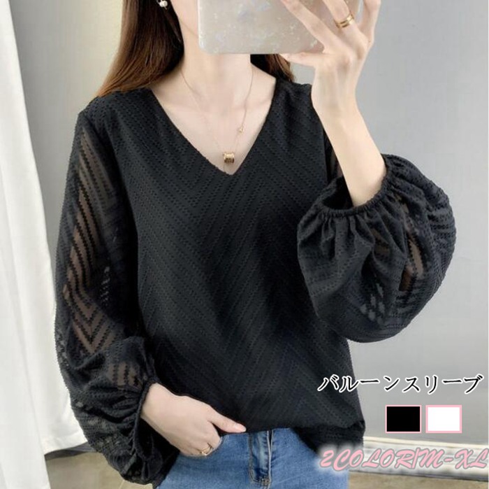 ブラウス バルーンスリーブ カットソー Vネック 体型カバー 着痩せ ゆったり トップス レディースファッション