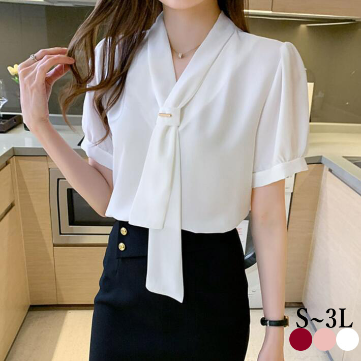 ブラウスレディースボウタイリボンVネックシャツ シフォン胸元 半袖大きいサイズスーツ インナーフォマールオフィス通勤夏S M L2L3L