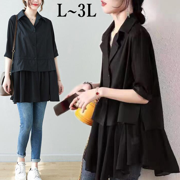 ブラウスレディース半袖フリルおしゃれギャザーブラウスシャツ シフォン切替5分袖 大きいサイズ オーバサイズ 楽ちん透け夏L2L3L