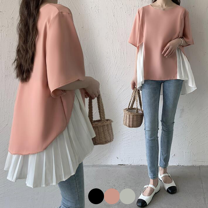 ブラウス レディース夏大きいサイズ半袖プリーツスキッパーシフォン前後差切替フリルトップスおしゃれ切替トップス カジュアル