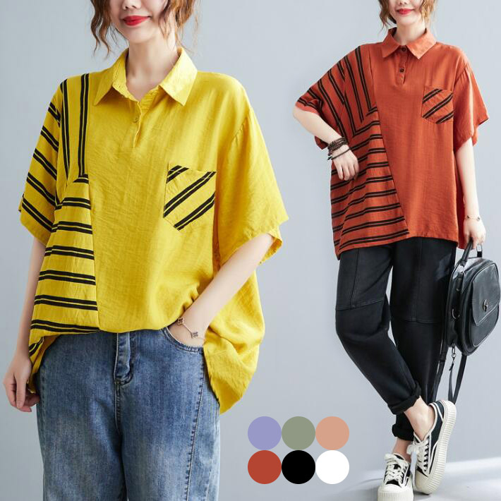 シャツブラウスレディース 半袖 大きめ ボーダーストライプ切替オーバーサイズゆったり楽チン夏レディースファッション トップス シャツ ブラウス