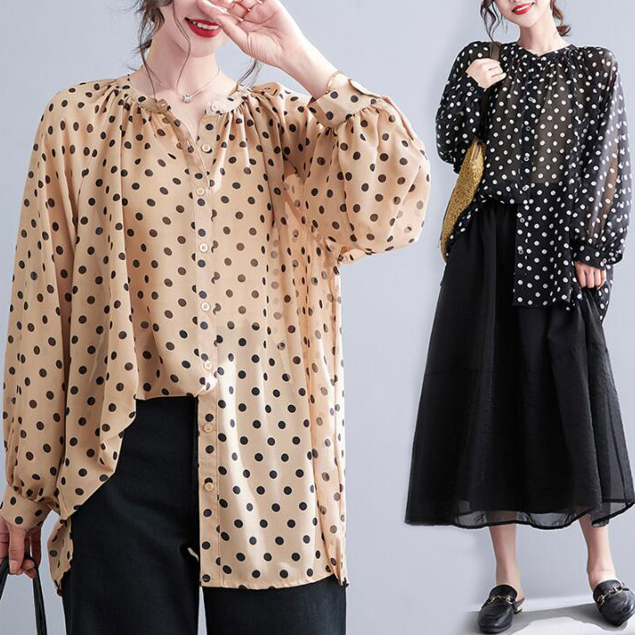 ブラウスシャツ羽織り綺麗め レディース長袖 ドット 水玉 バルーンスリーブヘンリーネック大きめ 涼しいカジュアル UV対策 UVカット日焼け止め 紫外線対策透け春 夏